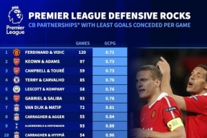 体育资讯10月24日讯 《转会市场网》统计了英超历史场均丢球数最少的20组中后卫搭档,该榜单只统计合作了50场以上的中后卫搭档。