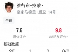 本场比赛20岁小将雅各布-拉蒙打进绝杀,这是其皇马生涯一线队4次登场取得的首粒进球。