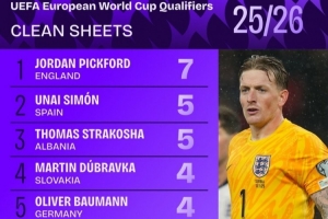 体育资讯11月20日讯 Squawka统计世欧预各队门将零封场次,皮克福德7场居首,乌奈·西蒙、斯特拉科沙5场第二。