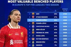体育资讯05月16日讯 德国转会市场网站统计了五大联赛身价最高的20名替补球员,巴萨中场加维排名第一,阿森纳小将恩瓦内里排名第二,努涅斯排名第三。