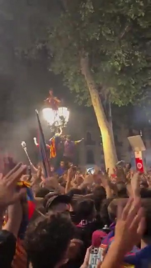 巴萨球迷们在球队庆祝时,高喊梅西的名字。