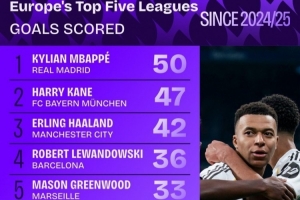 体育资讯1月19日讯 squawka统计了上赛季至今的五大联赛射手榜情况,姆巴佩力压凯恩居首。