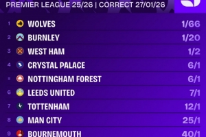 体育资讯1月27日讯 Opta超级计算机预测了本赛季英超球队的降级概率,狼队99.87%最高,热刺降级概率仅1.64%。