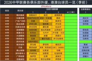 朱艺在个人微博中写道:2026中甲联赛冬窗正式关窗,中甲各队引援结束。以下为各俱乐部外援、港澳台球员一览。苏州东吴单外援,成为今年职业联赛唯一没有用满外援名额的球队。