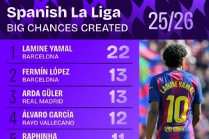 体育资讯3月26日讯 Squawka统计了本赛季西甲创造机会次数最多的球员,亚马尔以22次领衔。