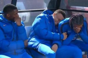 上半场转播镜头拍向法国队的替补席,登贝莱、姆巴佩和奥利塞在替补席上说说笑笑,姆巴佩更是靠在奥利塞的身上开怀大笑。