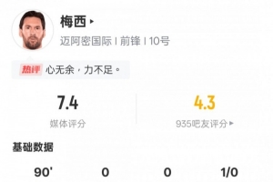 体育资讯5月19日讯 美职联常规赛,迈阿密国际0-3不敌奥兰多城。本场比赛,梅西首发出战,6次过人全场最多,还有3次关键传球,但28次丢失球权也是全场最多,评分7.4。