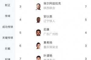 体育资讯7月7日讯 中甲第15轮比赛结束争夺,助攻榜方面,辽宁铁人外援邦本宜裕12次助攻排名第一,广东广州豹外援若昂-卡洛斯7次助攻排名第二,陕西联合外援埃尔阿兹拉克7次排名第三。