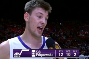 上半场,爵士球员菲利波夫斯基表现出色,出战13分钟,投篮9中3,三分球6中2,罚球5中4,拿到12分10篮板1助攻2盖帽的数据。