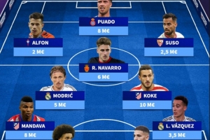 中场:莫德里奇(皇马,500万欧元)、纳瓦罗(马洛卡,600万欧元)、科克(马竞,1000万欧元)