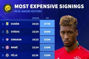 体育资讯8月16日讯 利雅得胜利官方宣布签下拜仁边锋科曼,德国转会市场列出了利雅得胜利队史最贵引援排名,杜兰7700万欧居首,科曼2500万欧排在并列第7位。