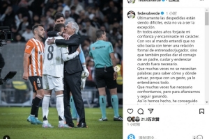 体育资讯5月24日讯 皇马主帅安切洛蒂今夏离任,队内中场巴尔韦德社媒发文与之告别。