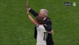 赛后安切洛蒂搂着莫德里奇谢场告别伯纳乌,安帅深情拥抱莫德里奇。