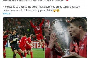 卡拉格社媒晒出当时的照片,并写道:“今天是‘伊斯坦布尔奇迹’二十周年纪念日。”