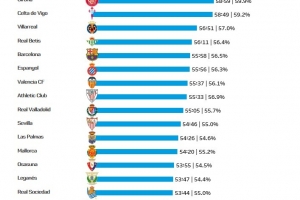 体育资讯5月27日讯 本赛季西甲联赛已经落幕,数据平台OPTA统计了本赛季西甲各队的场均净比赛时长,其中皇马以59分40秒居首,马竞59分25秒其次,巴萨55分58秒排在第7位。