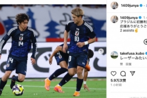 赛后伊东纯也更新社媒,晒出比赛照并配文庆祝胜利:“首次击败巴西队!感谢各位来到现场支持我们!收获2次助攻。”