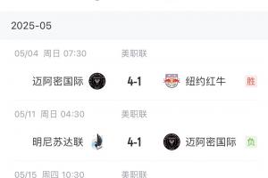 体育资讯05月15日讯 美职联常规赛,迈阿密国际与圣何塞地震3-3战平,迈阿密各项赛事近6场比赛仅1胜,此前中北美冠军杯也止步半决赛。