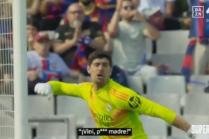 下半场,维尼修斯从德容手里夺过皮球,快开任意球,结果直接传给了亚马尔。随后亚马尔禁区前打出一脚极具威胁的远射,库尔图瓦扑救之后,挥拳怒吼维尼修斯“狗娘养的!”(puta madre)