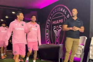 美职联社媒晒出视频,西班牙网球名将阿尔卡拉斯来到现场,观看这场比赛,他与出场的迈阿密球员们互动寒暄。