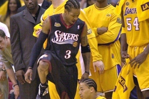 2001年NBA总决赛G1,艾弗森对阵湖人面对泰伦卢命中跳投后跨越了他