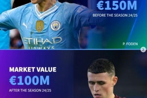 福登(曼城),现身价1亿欧,赛季前1.5亿欧,-5000万欧