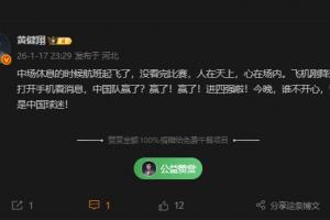 黄健翔:中场休息的时候航班起飞了,没看完比赛,人在天上,心在场内。飞机刚降落赶紧打开手机看消息,中国队赢了?赢了!赢了!进四强啦!今晚,谁不开心,谁就不是中国球迷!