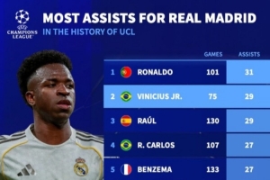 体育资讯1月21日讯 本轮欧冠,皇马6-1大胜摩纳哥,维尼修斯送出2次助攻,根据德转统计,维尼修斯欧冠助攻数升至皇马队史第二。