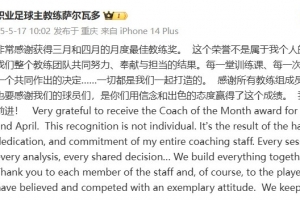 “非常感谢获得三月和四月的月度最佳教练奖。 这个荣誉不是属于我个人的,而是我们整个教练团队共同努力、奉献与担当的结果。每一堂训练课、每一次分析、每一个共同作出的决定……一切都是我们一起打造的。 感谢所有教练组成员,当然也要感谢我们的球员们,是你们用信念和出色的态度赢得了这个成绩。我们继续前进!”