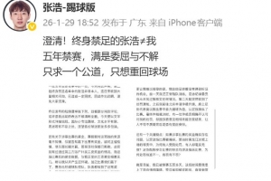 体育资讯1月29日讯 被中国足协禁足五年的前黑龙江冰城球员张浩更新社媒,对于自己踢假球的指控进行了回应。