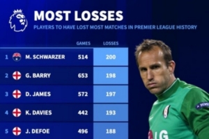 体育资讯2月21日讯 德国转会市场统计了球员在英超的输球场次,并列出英超历史输球场次榜,施瓦泽200负最多,巴里198负第二。
