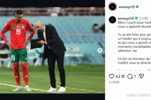 体育资讯3月6日讯 摩洛哥国家队主帅雷格拉吉离任,摩洛哥前锋恩内斯里社媒与之告别。