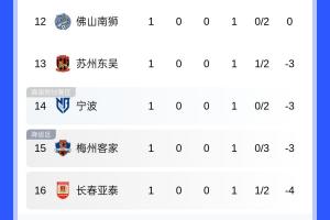 体育资讯03月15日讯 新赛季中甲首轮比赛结束,目前积分榜上,延边龙鼎位列榜首,两支“降班马”梅州客家、长春亚泰首轮均告负,同时因为被扣分,两支球队暂时垫底。