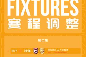 体育资讯03月17日讯 中甲联赛官方宣布,中甲第2轮陕西联合vs大连鲲城比赛时间调整至9月27日19点。