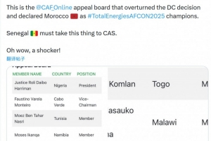 Velile Mnyandu写道:“这就是非足联上诉委员会名单,他们推翻了纪律委员会的决定,宣布摩洛哥获得非洲杯冠军,塞内加尔必须将此事上诉至国际体育仲裁法庭。”