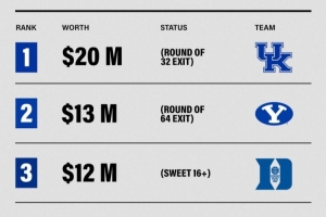而紧随其后的是杨百翰大学的1300万美元(止步首轮)、杜克大学的1200万美元(目前已进入甜蜜16强)、阿肯色大学的1150万美元(目前已进入甜蜜16强)、路易斯维尔大学的1050万美元(止步32强)。