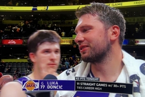 谈到外界关于湖人的负面言论,东契奇说:“我们才输了一场比赛,大家就在说我们的坏话。所以,能够反弹并赢得比赛真是太棒了。”