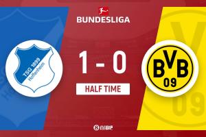 第38分钟,霍村获得点球!克拉马里奇右路弧顶内切打门打在滑到的聚勒手上,裁判经过VAR回放判罚点球,克拉马里奇主罚点球破门,随后聚勒拉伤被换下,霍芬海姆1-0多特。↓