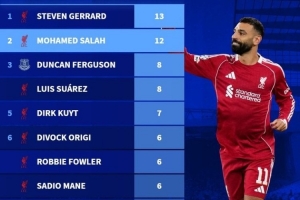 数据统计显示,萨拉赫在默西赛德郡德比历史射手榜位列次席。