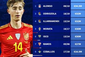 体育资讯5月18日讯 近日,皇马官方宣布了从伯恩茅斯引进西班牙后卫怀森,据德转统计转会费为5900万欧元,创造了皇马引进西班牙球员的转会费纪录,同时也排在西班牙籍后卫转会费的第3位。