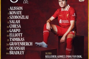 利物浦首发:1-阿利森、5-科纳特、8-索博斯洛伊、11-萨拉赫、14-基耶萨、18-加克波、19-埃利奥特、21-齐米卡斯、38-赫拉芬贝赫、78-宽萨、84-布拉德利