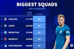 体育资讯7月8日讯 《转会市场》统计了当前五大联赛一线队人数最多的球队情况,切尔西无悬念居首。