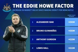 德转列近年新援加盟纽卡后升值榜:欧元