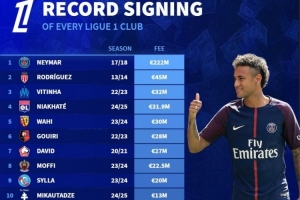 体育资讯7月15日讯 德国转会市场统计了法甲各俱乐部的最贵引援,并列出榜单,巴黎2.22亿欧签下内马尔居首。