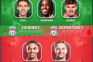 1-利物浦:转会支出3.0868亿欧,转会收入6330万欧,净支出2.4538亿欧