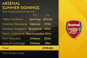 体育资讯7月25日讯 近日,天空体育盘点了阿森纳截止目前的引援情况,他们引进六名球员一共花费了近2亿欧元。
