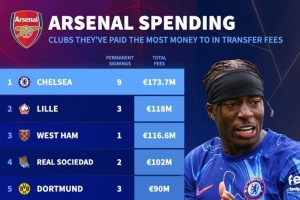 阿森纳近20年转会费支出最多的俱乐部:欧元