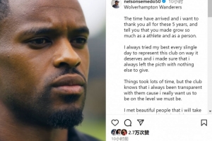 体育资讯7月31日讯 狼队边卫塞梅多将转会费内巴切,他更新社媒动态,与狼队告别。