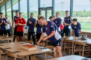 体育资讯8月13日讯 曼联官方更新社媒动态,晒出队友们为德里赫特庆祝生日的照片。