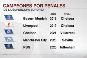 据ESPN统计,巴黎是欧超杯历史第5支通过点球大战夺冠的球队,此前4支是拜仁(2013)、利物浦(2019)、切尔西(2021)和曼城(2023)。