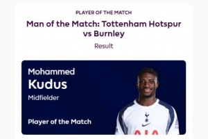 此役,热刺夏窗新援库杜斯首发出战,在第85分钟被替换下场,送出两记助攻,球员以43%的得票率当选英超官方全场最佳球员。